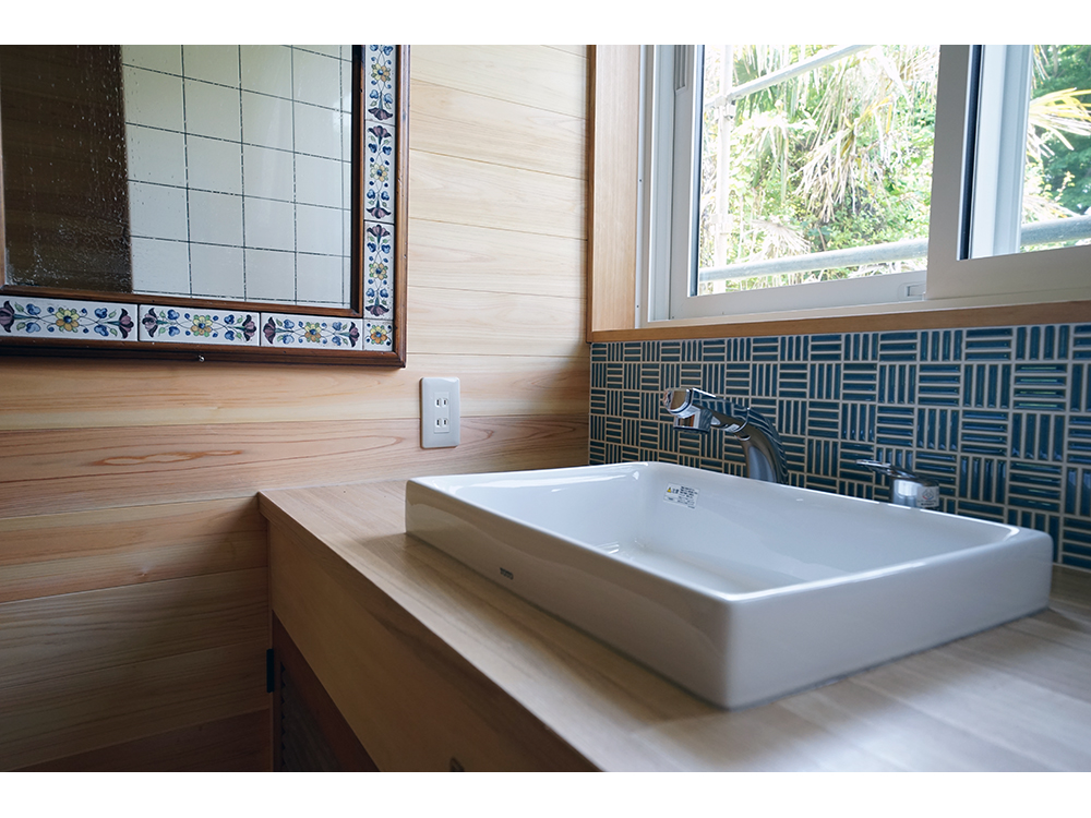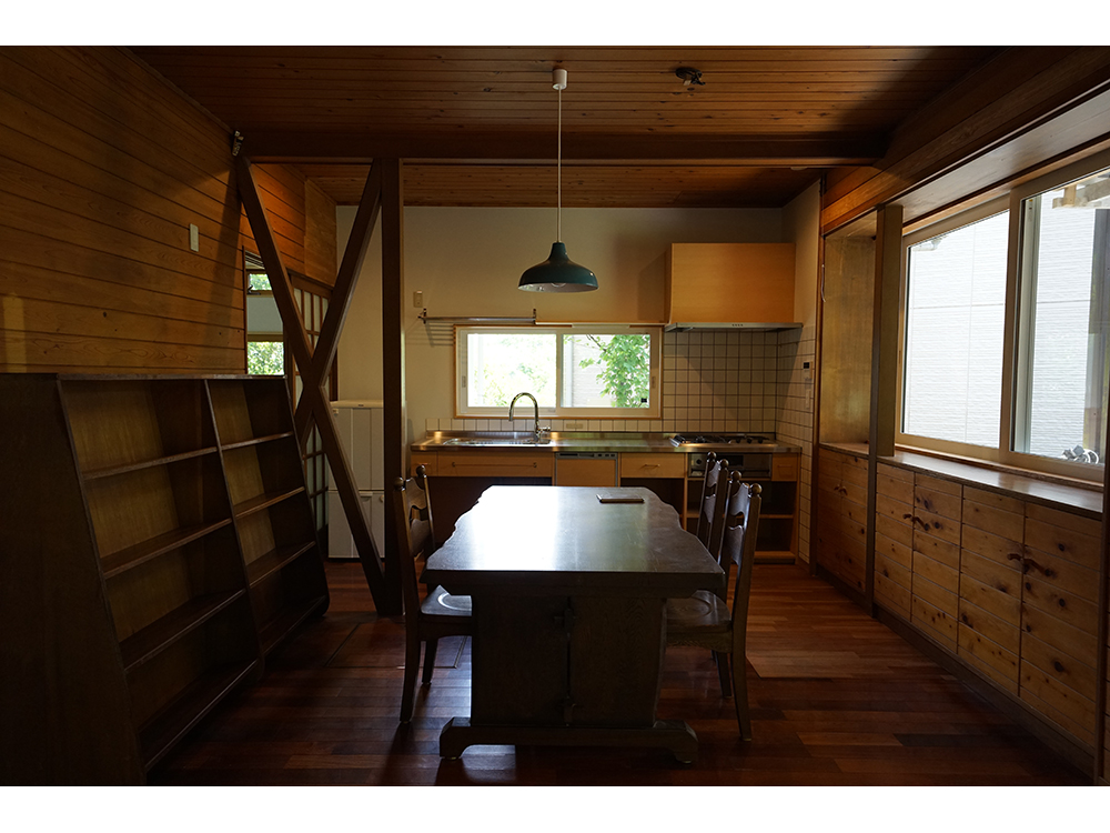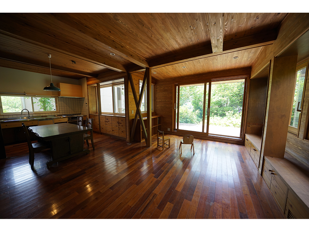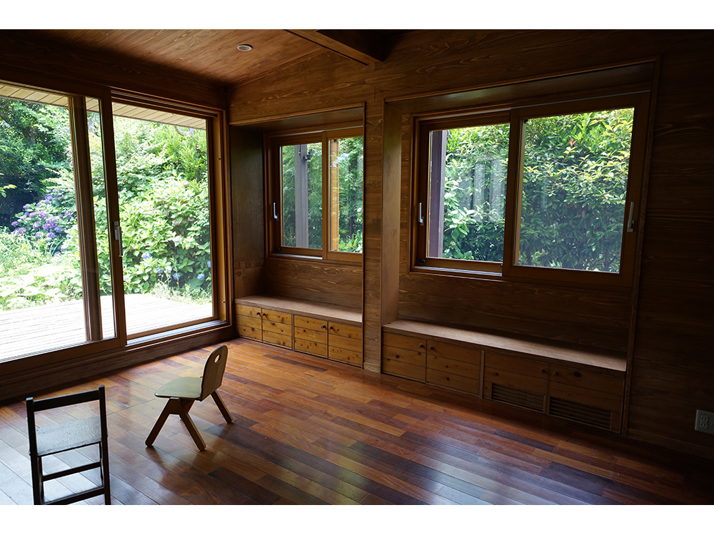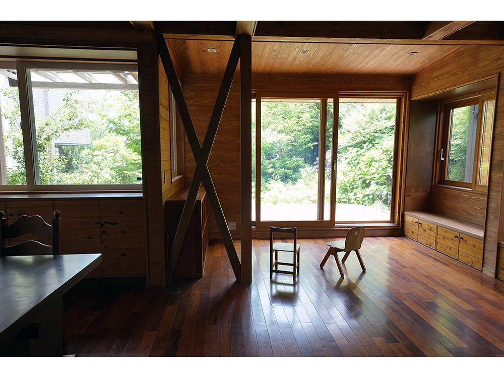 庭は元々非常に手入れの行き届いた庭であり、よく吟味された植栽計画で窓配置もそれに伴っている。リビングの南角の3箇所の大窓だけでも木製サッシに交換し、また腰高収納をベンチに加工して庭との境界である窓辺が楽しい空間になっている。