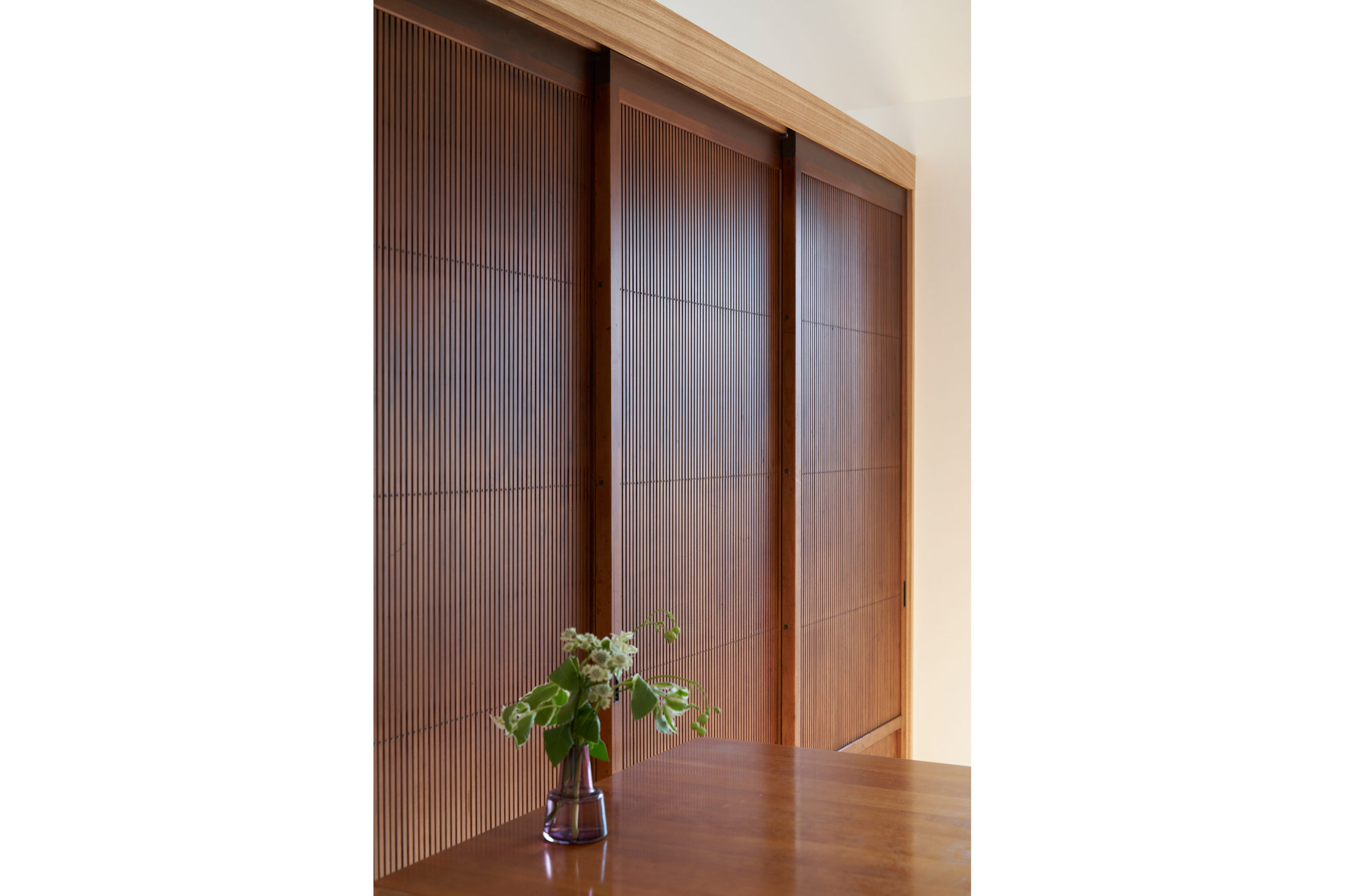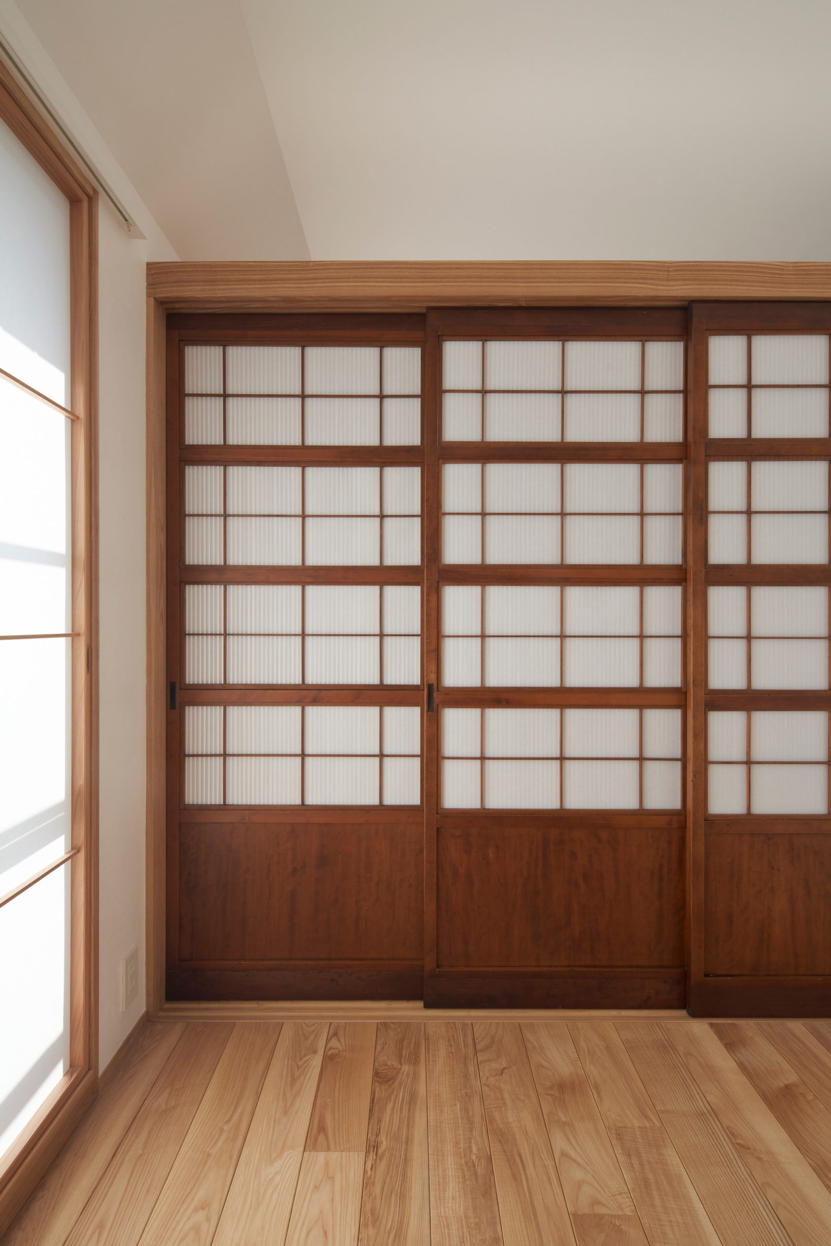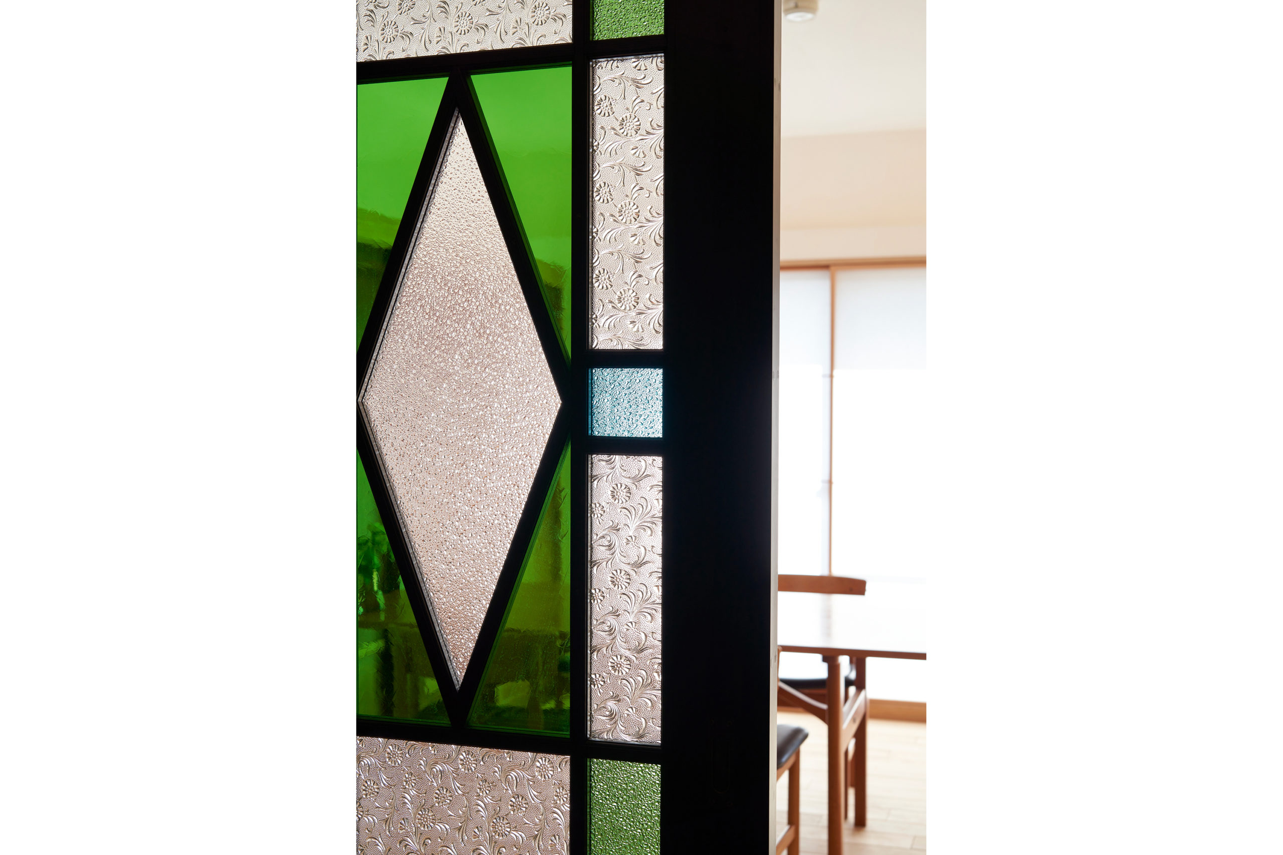 古建具屋に共に行き、格子戸とステンドグラスドア 二つの大正時代の越後の古民家解体された際に運ばれた古建具を施主が気に入りました。この二つの古建具の両方とも今では職人も作れない精度の高い、その物だけ見ていてもため息と共にリスペクトの気持ちが湧き上がってくるようなものでした。ただ、別の家から持ってきたと思われる大変素敵だがバラバラな独立したデザインの二つの建具を一つの空間に両立させることが施主とともに悩ませられました。壁の漆喰の美しさ・床の国産タモ無垢の素材感と古建具を納めるディテール上での工夫も重ねて、当初の危惧を超えてかえって面白い空間になりました。