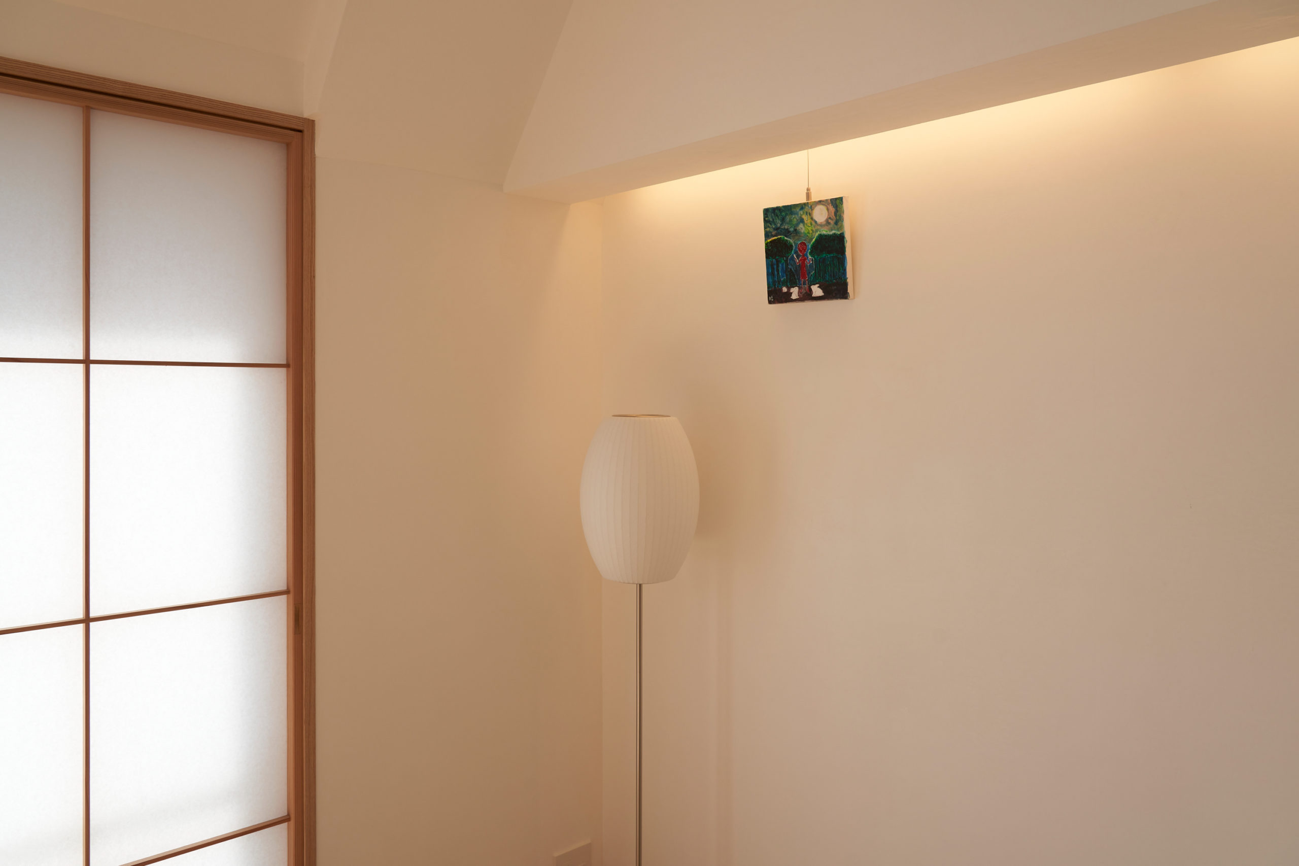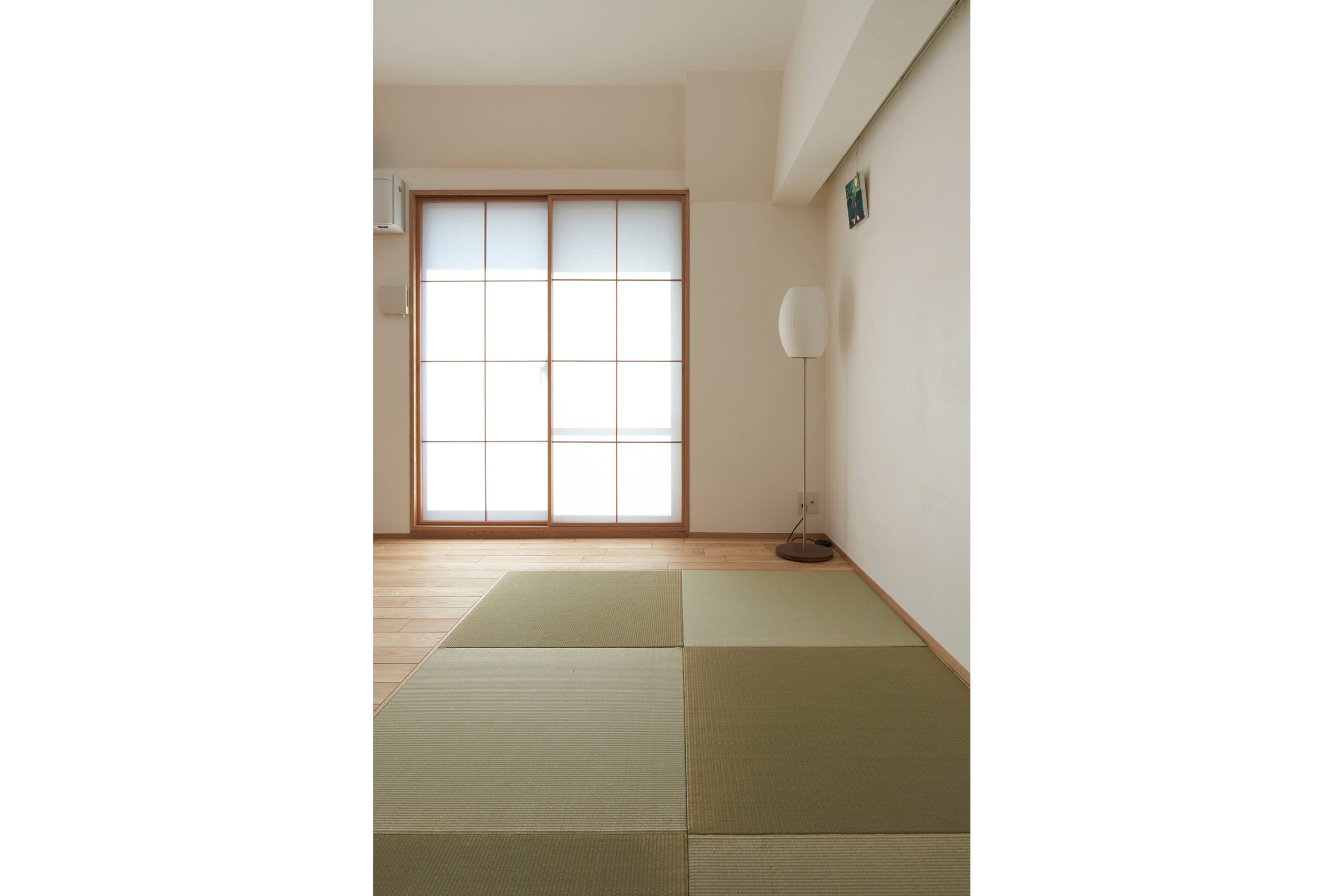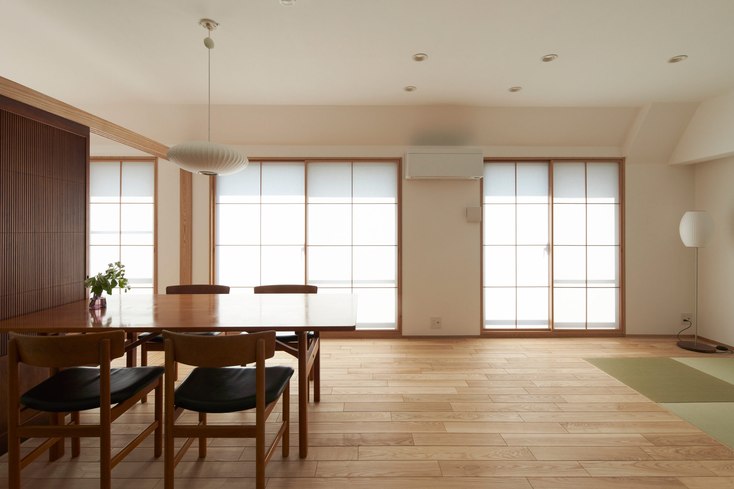 築20年真南向きのマンション中間階で、南窓前にも遮るものがないという立地は熱的に非常に優良で、施主の話でも既存で冬は快適、真冬以外は暖房の出番は特にないと言う話でした。今は断熱リノベの必要なしということでしたので、(内窓など断熱リノベの案も提出はしましたが・・また別の機会に)。3面の掃き出し窓に入れた障子(強化障子紙)の効果で断熱的にも冬の夜間の窓辺からくる冷気の回り込み(コールドドラフト)にある程度効果を示します。