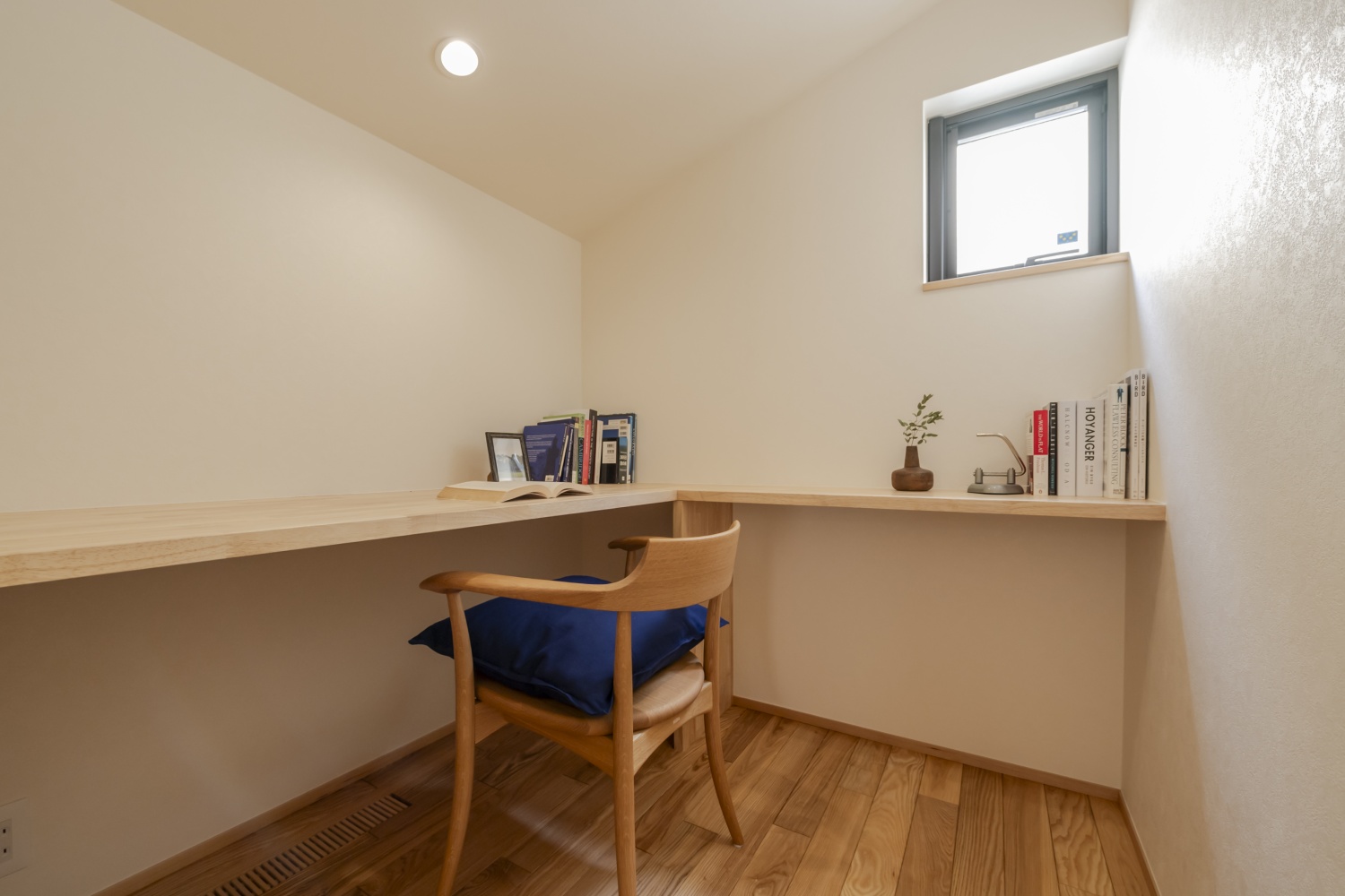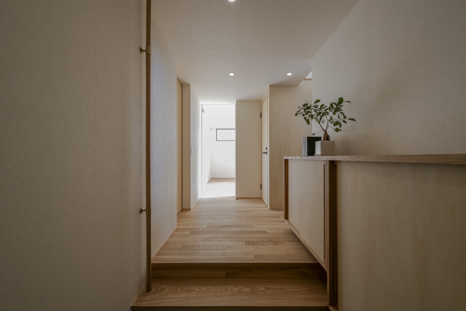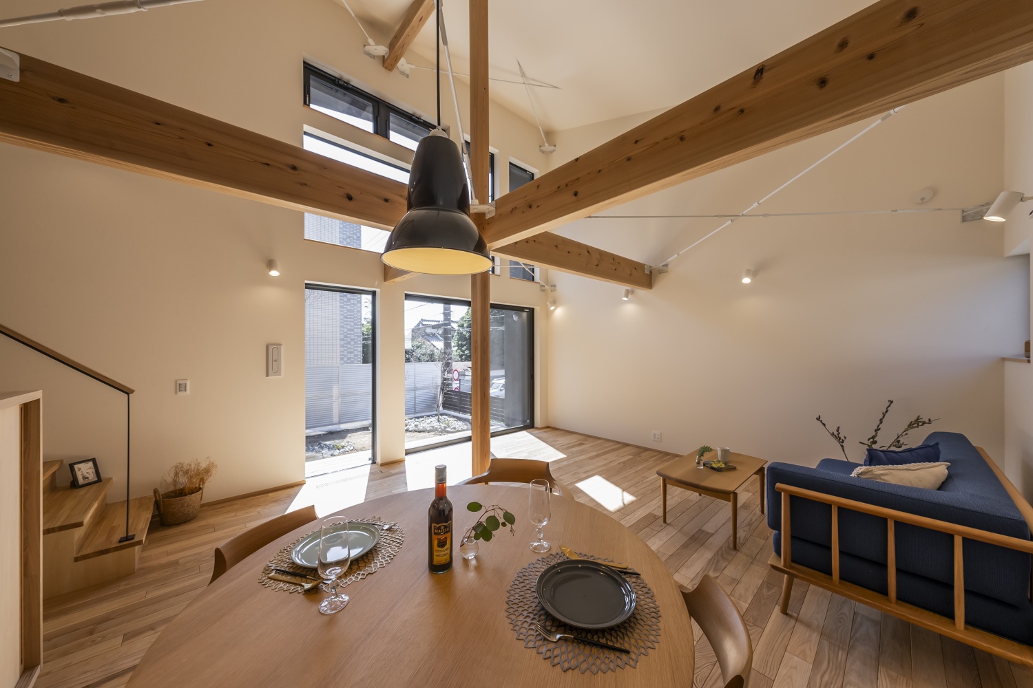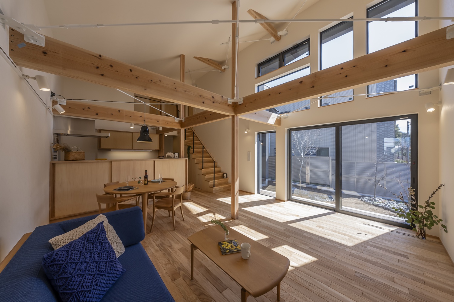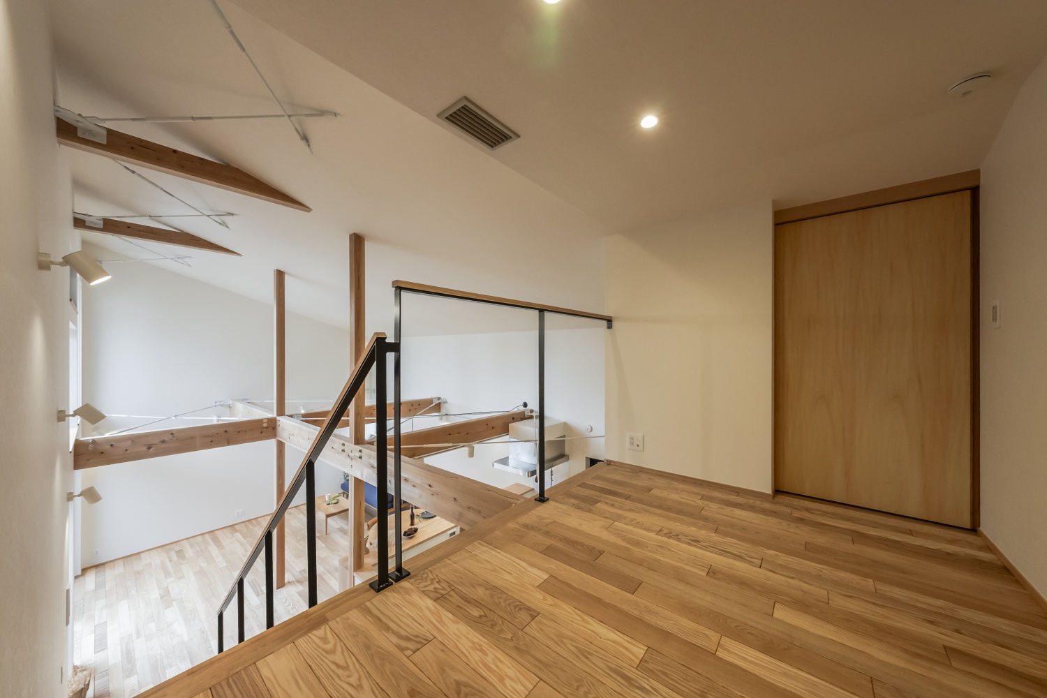 考えて、基本的生活に属する空間は1階に設置し、平屋+天井の低いロフト的な最小限の個室という組み合わせです。
