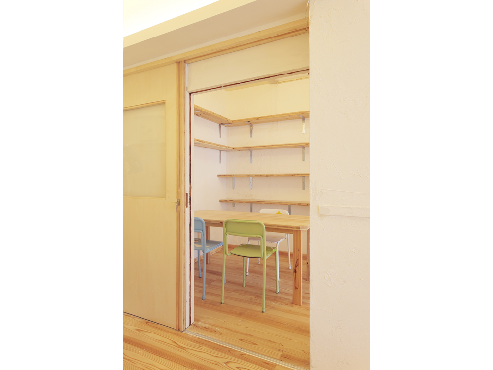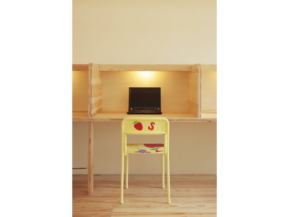 杉間伐材を使った無垢パネルを床や机にオイル塗装で、壁は漆喰で、、と手抜かりなく、