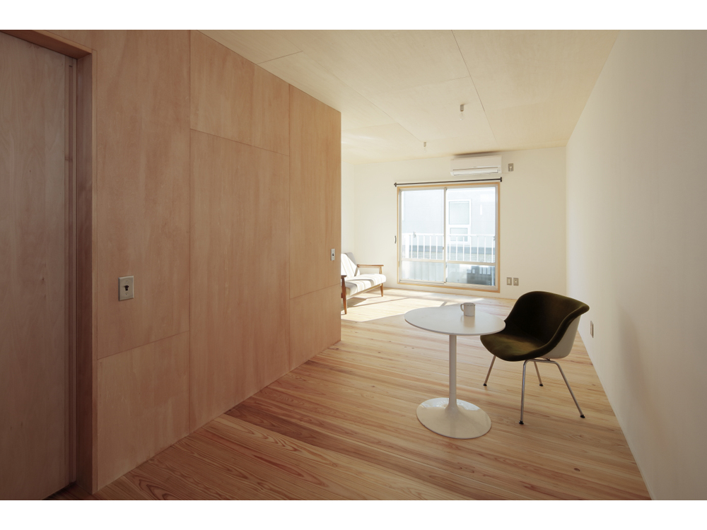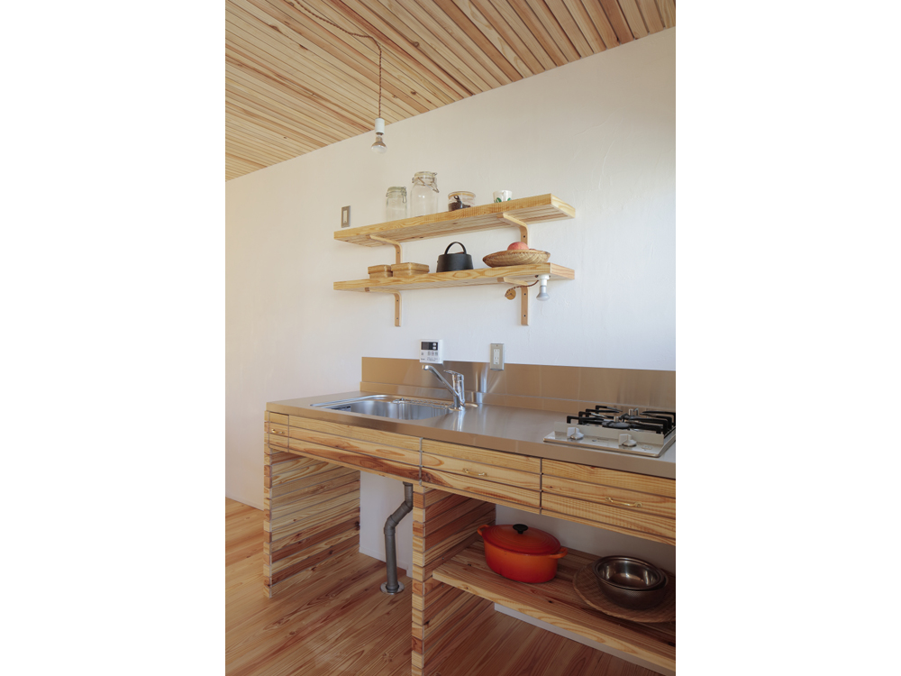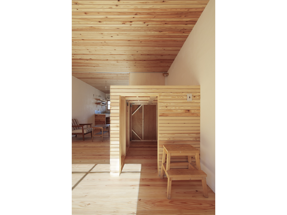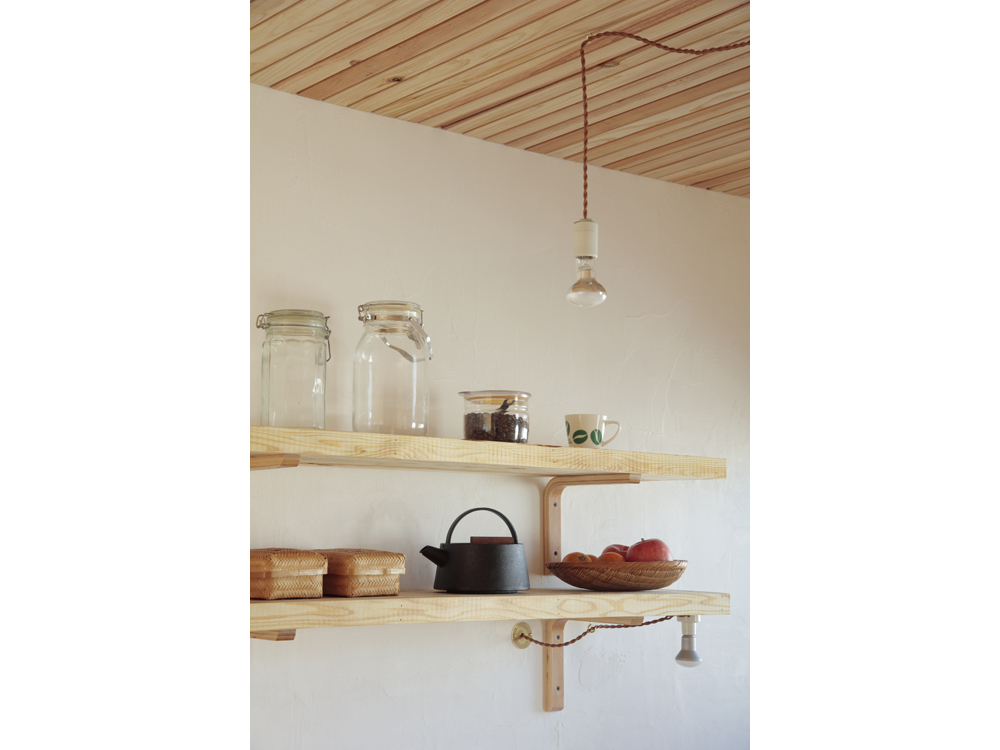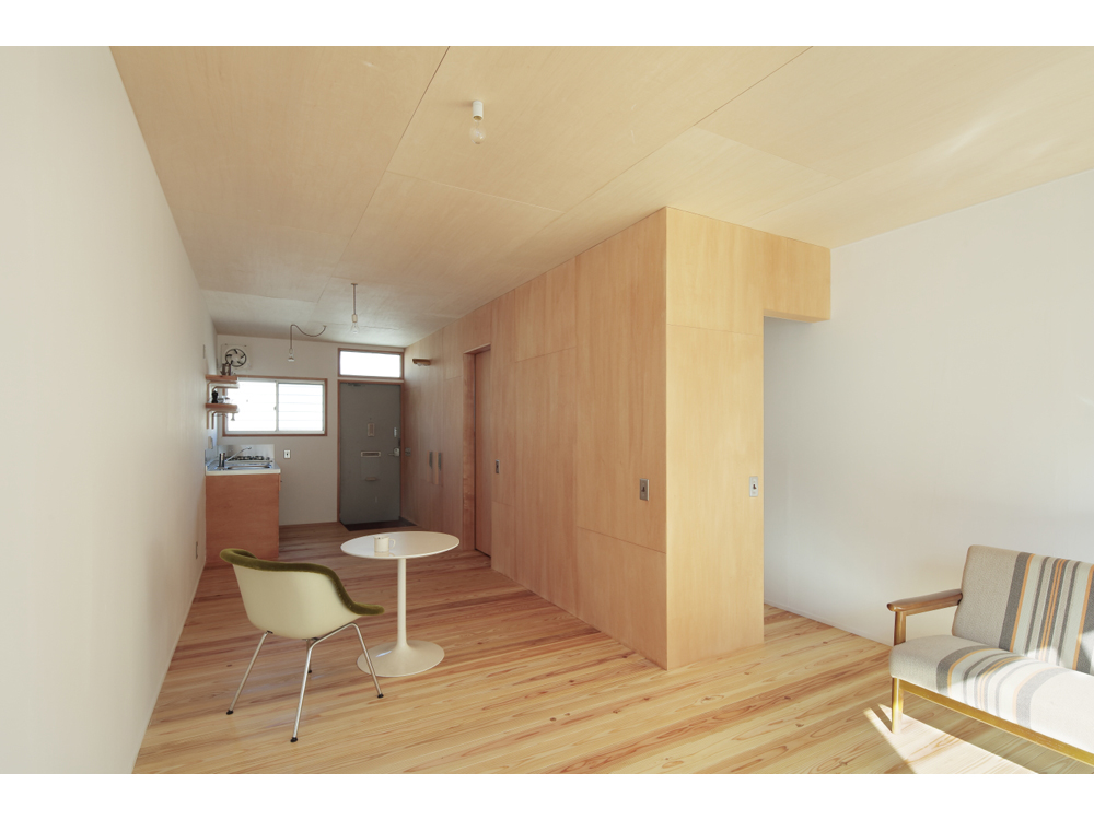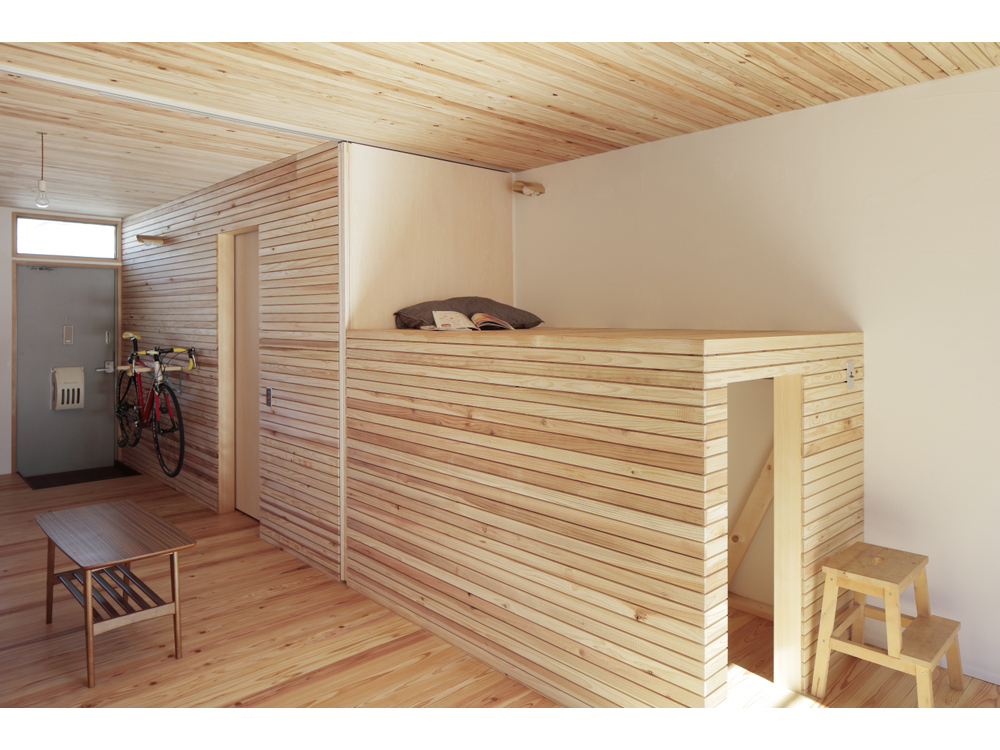 アパートではありますが、杉無垢床をはじめ、杉壁天井、漆喰やオイル塗装、水性ペンキなどお馴染みの素材で構成しています。DIYも何度かやるうちにレベルが上がってくるのが面白いです。杉の無垢材、漆喰仕上げで吸放湿性のある素材の性能もさる事ながら、ツルピカでなく、微妙な凹凸がある素材に日の光がさすと緩やかな反射が優しく、部屋に落ち着きをもたらしています。壁面や天井に使った材料は杉の貫材と呼ばれる通常木造の家の下地に使う材料ですが、あえて仕上げ材として使い、杉無垢材のもつ特有の赤白の色味のグラデーションが単一になりがちなワンルームに奥行きを与えています。こういう部屋はDIYを誘発するものです、釘を打ってもOKな一面(写真、木部)釘が効くように下地のある壁面を作りました。どんどん作り込んでいって欲しいです。