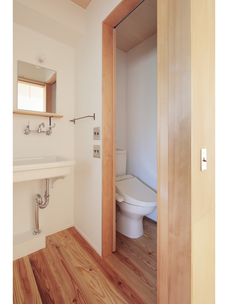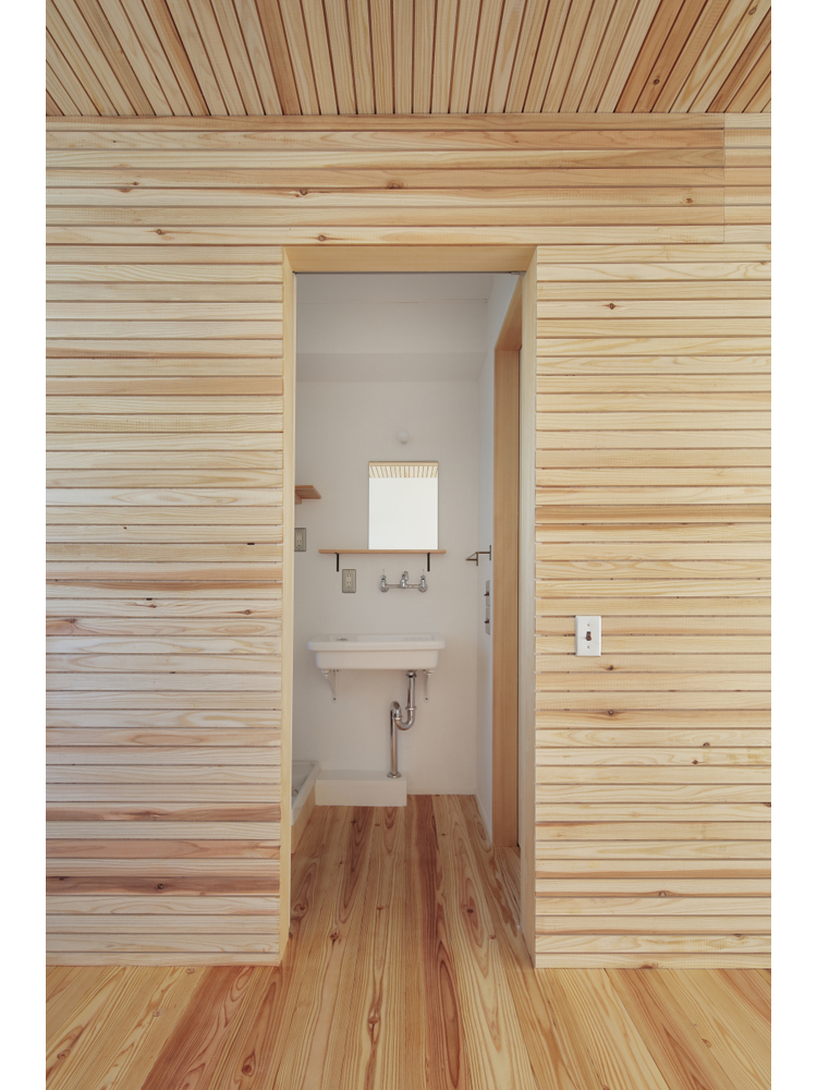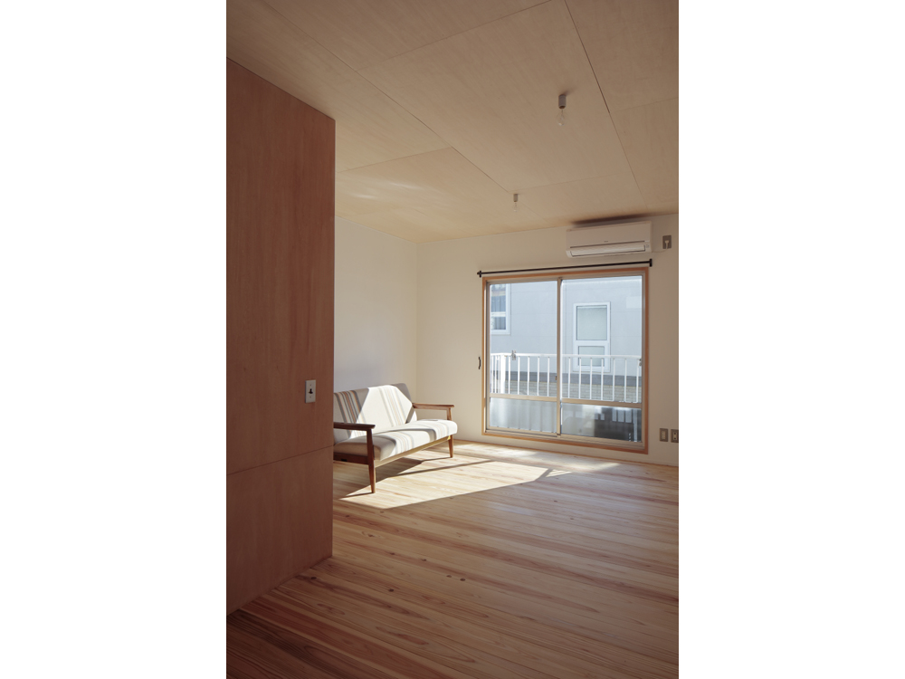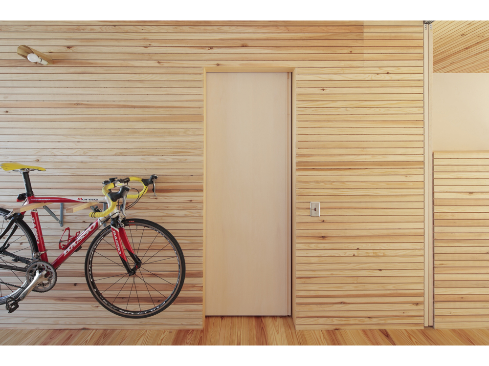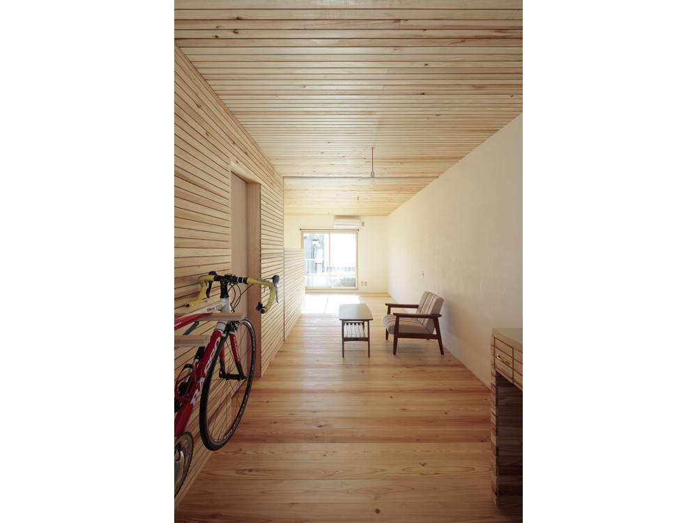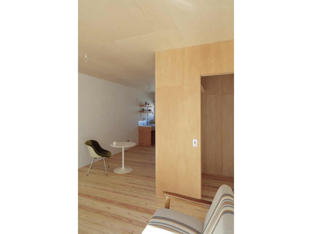 アパートではありますが、杉無垢床をはじめ、杉壁天井、漆喰やオイル塗装、水性ペンキなどお馴染みの素材で構成しています。DIYも何度かやるうちにレベルが上がってくるのが面白いです。杉の無垢材、漆喰仕上げで吸放湿性のある素材の性能もさる事ながら、ツルピカでなく、微妙な凹凸がある素材に日の光がさすと緩やかな反射が優しく、部屋に落ち着きをもたらしています。壁面や天井に使った材料は杉の貫材と呼ばれる通常木造の家の下地に使う材料ですが、あえて仕上げ材として使い、杉無垢材のもつ特有の赤白の色味のグラデーションが単一になりがちなワンルームに奥行きを与えています。こういう部屋はDIYを誘発するものです、釘を打ってもOKな一面(写真、木部)釘が効くように下地のある壁面を作りました。どんどん作り込んでいって欲しいです。
